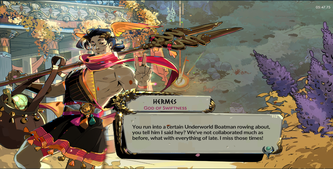 bitch we are BACK in hades mode!!! let's go!!! I'm almost done with the first ending I think, I have beat Cronos the 7th time and am now going back up the peak with Gigaros to fuck up Typhon one last time, I'm intrigued where the plot might be going ... Hermes is one of the few gods from the first game whose art I really like in this one. thinking fondly on the Hermes/Charon yaois from game 1 that were floating around.