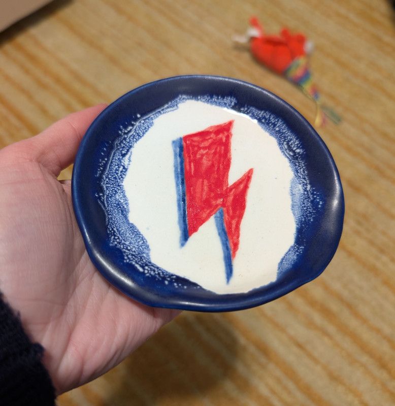holiday card block print! they will not get in the mail til after christmas, oh well. will post an image at the bottom of this post so if you want it to remain a surprise, don't scroll all the way down hahaha pottery (boyfriend, if you are reading, this is the one to scroll real fast past): sake container for mom, One Real Mug (I think this the first not-teacup I've made, lol), two spoonrests (Bowie one for brother, other for boyfriend), matcha bowl (can you tell I'm really into the pool bottom design lol), started a new cave painting mug, 'stack' of mugs (there's a chipped teal one too that I'll add a picture of later), a few unremarkable bowls (I do really like the matte blue though)