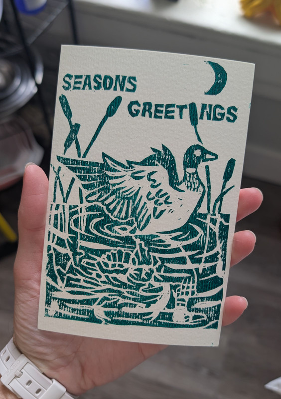 LAST WARNING TO CLICK OFF FOR HOLIDAY PRINT SPOILERS. I printed a bunch of these directly on my blank postcards but that may be a mistake. not because of the texture - I think that's kinda nice actually - but because holy cow the dry time is Long. so I think I am printing more on thinner paper, because those are drying way faster, and then pasting them onto the postcards instead? lol. or just mailing some of them via envelope again.