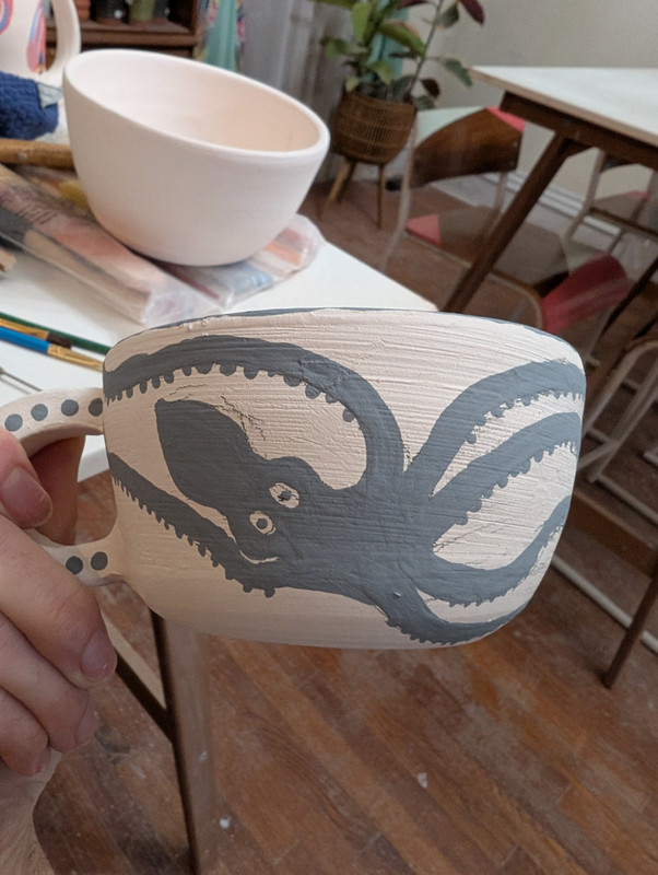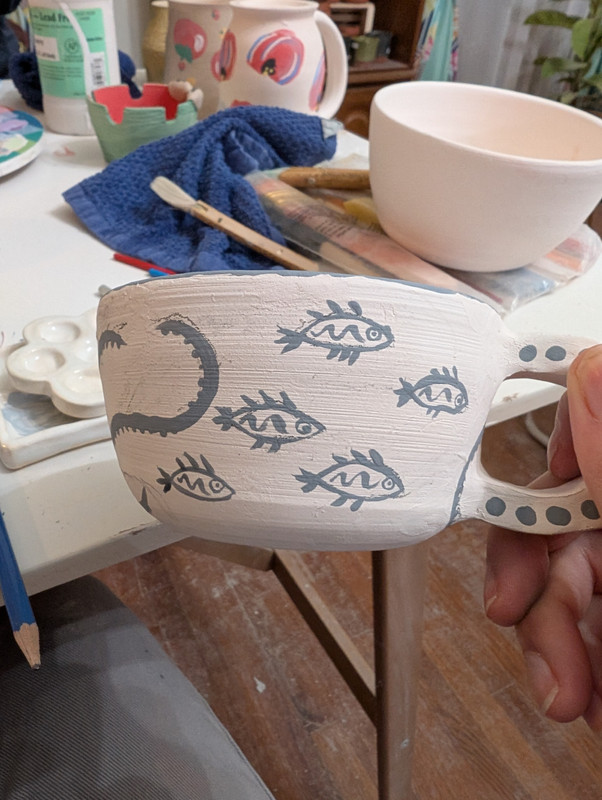 - speed painted some little cave paintings onto this mug. i agonized over the exact cave paintings to put on it for like months and then i was like. this is stupid. be decisive and it will come out fine. and it did